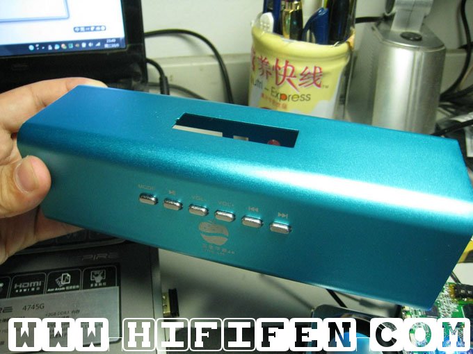 此音箱音量开大了会有杂音,怀疑是电池不给力。打开开关没反应……插上电源线正常,竟然还有fm收音机,插上耳机线当天线还能收好多台声音也不错。不过拔掉电源声音立马就变味了,滋滋啦啦的慢慢就没声了,果断拆开瞧瞧。拆之前竟然忘了拍照片……