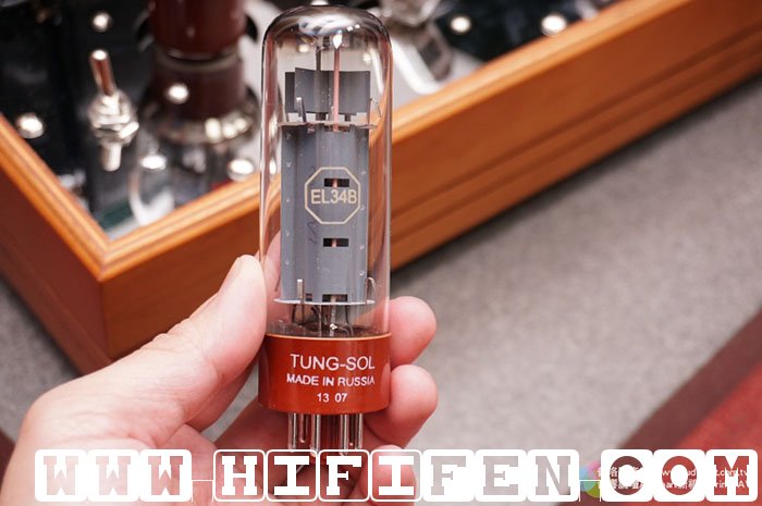 一开箱就会看到真空管.两支本机标准配备 Tung-Sol EL34B,(亦可采用KT88功率管).小的是信号管,英国古典管 CV4068/13D3 ,可代以12AU7.